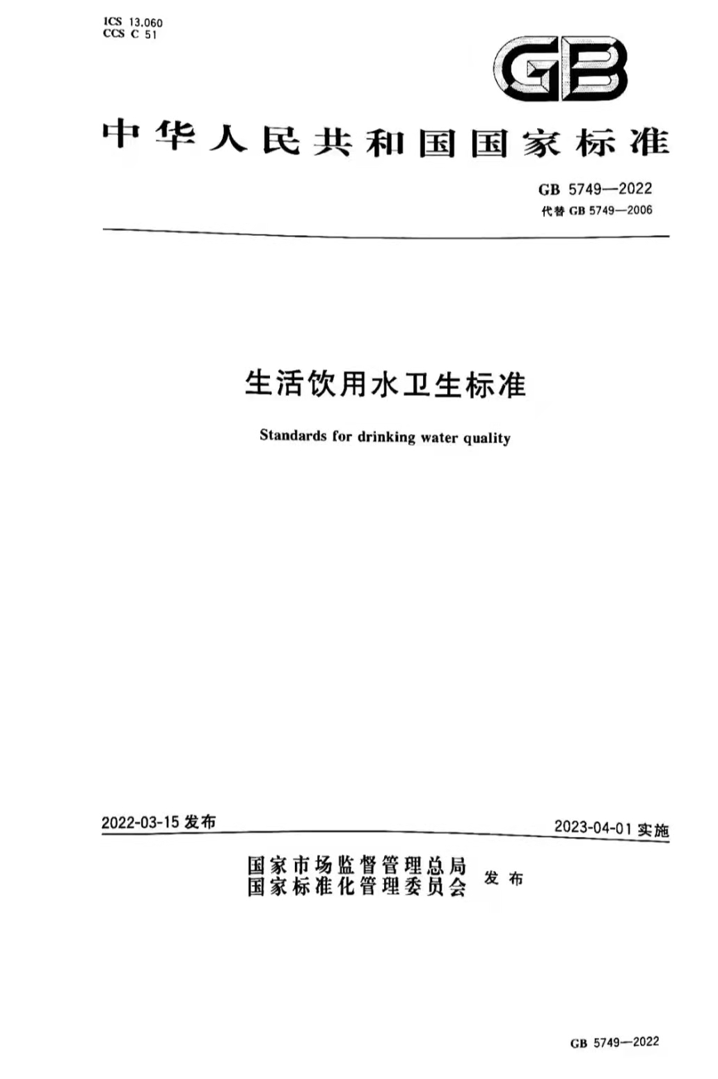 2022年3月15日,國家市場監督管理總局和國家標準化管理委員會聯合發布中華人民共和國國家標準公告(2022年第3號)“關于批準發布《生活飲用水衛生標準等5項強制性國家標準的公告》”,正式批準《生活飲用水衛生標準》5項強制性國家標準。